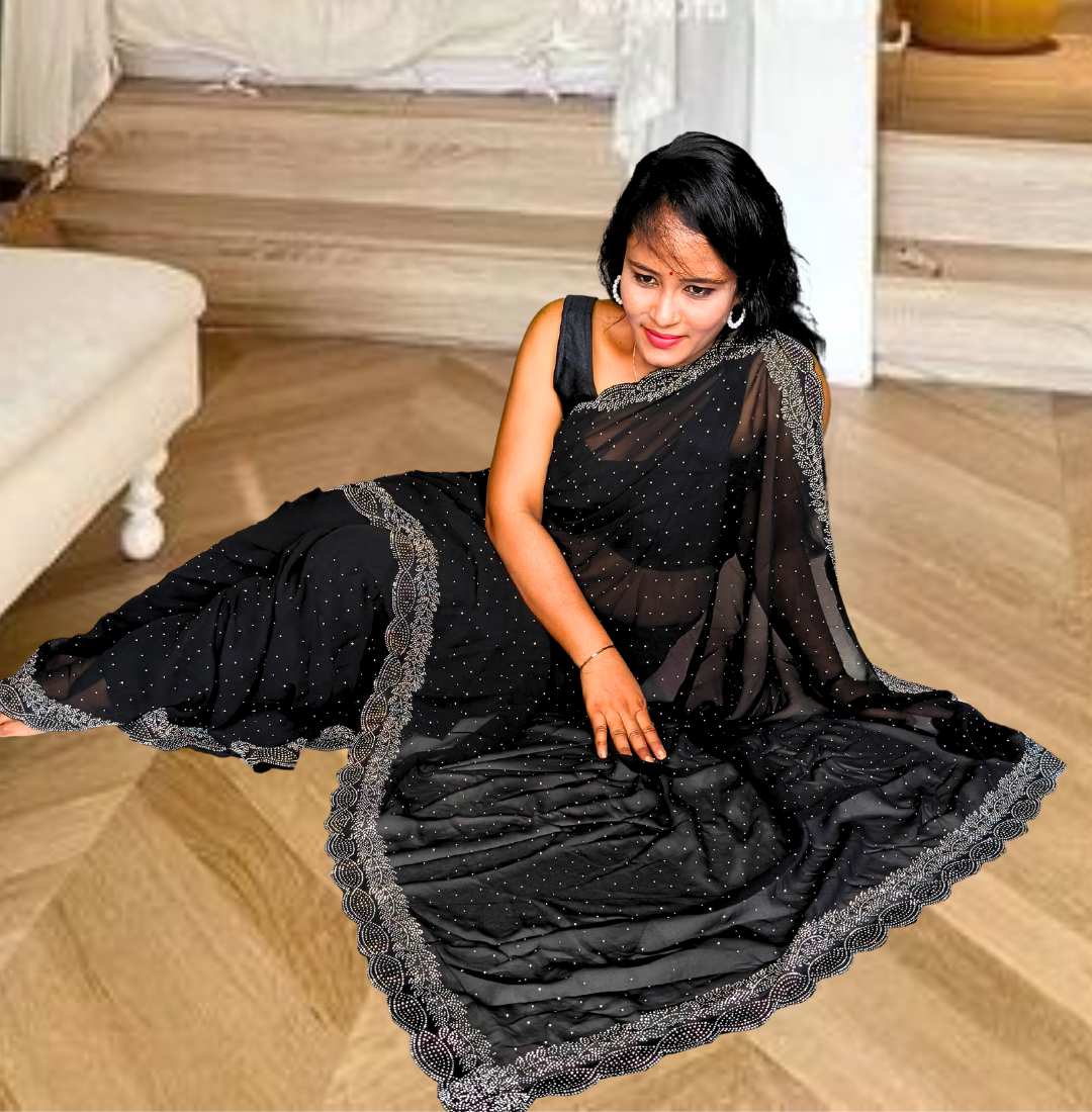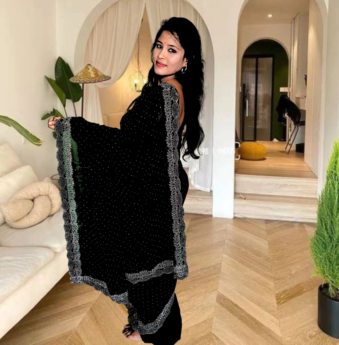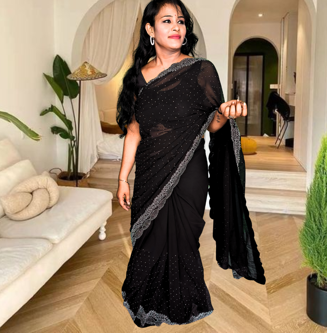 | Name : | S4s Black Karishma Siroski Stones Lace Georgette Party Wear Saree |