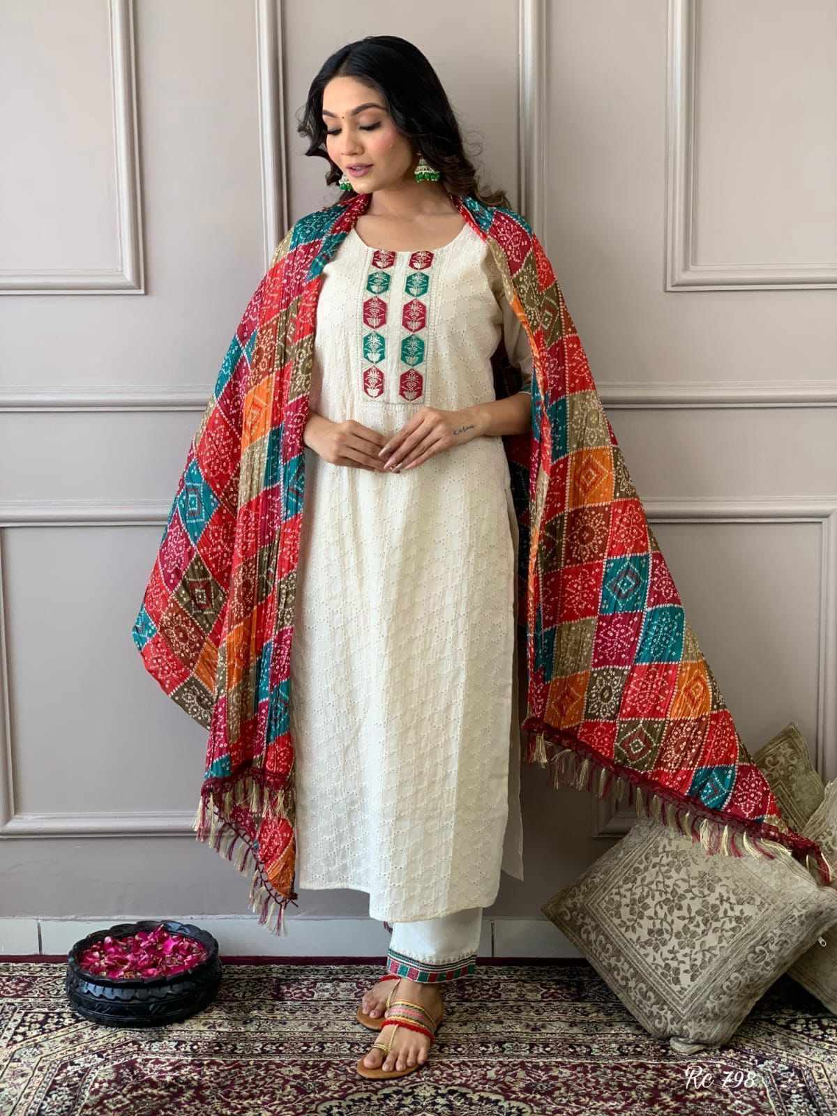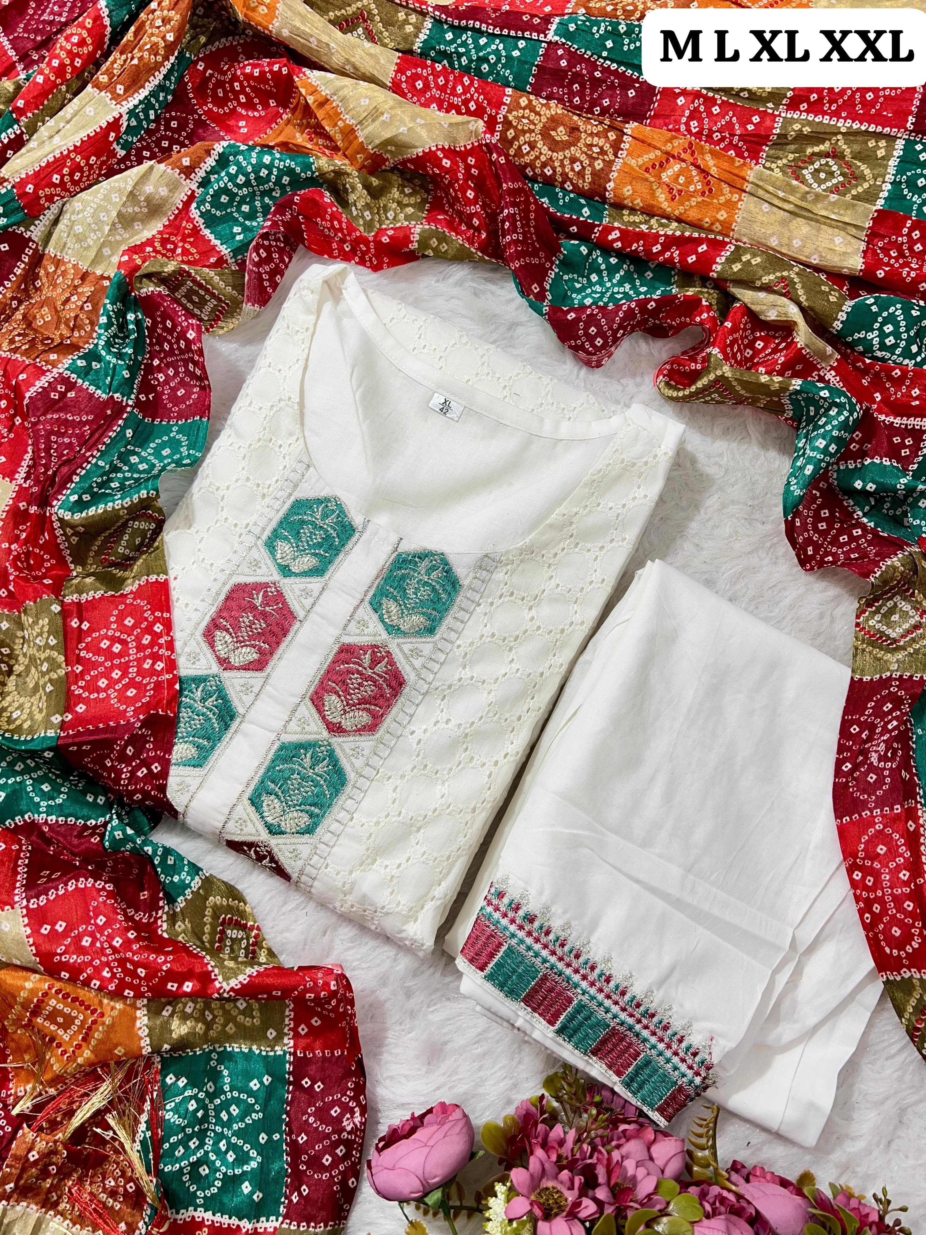 Schiffli chickan cotton top with cotton lining inside with hand work and with cotton pant enclosed with schifflie. Paired with full printed cotton silk duppata